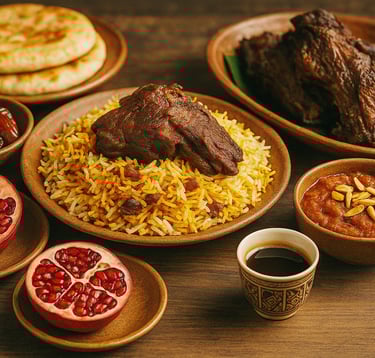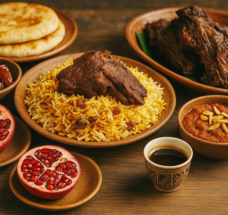 Enjoy the smoky depth of shuwa, the sweetness of halwa, and the aroma of cardamom coffee served with dates.